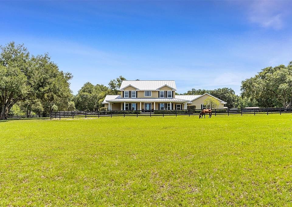Welcome to your serene 6.6-acre retreat in picturesque Lady Lake, where every evening invites you to savor breathtaking sunsets from your own custom-built oasis. Originally crafted by a master home builder for his personal enjoyment, this residence leaves no desire unfulfilled. The property is completely fenced, making it an ideal haven for your beloved horses and farm friends. Step into a world of entertainment in your backyard, boasting a magnificent pool and cascading spa. The pool area is surrounded by approximately 2800 square feet of delightful entertainment space. Situated a mere 5 miles from The Villages, this dream home unfolds with a spacious open floor plan and a jaw-dropping floor-to-ceiling stone fireplace. Soaring 18' ceilings create an expansive ambiance throughout. The kitchen is a chef's delight, meticulously remodeled to feature a generous center island, pristine quartz countertops, a farmhouse-style sink, custom cabinetry, top-tier appliances, and every imaginable convenience. Retire to the Master suite, complete with generously sized walk-in closets, an indulgent garden tub, a separate shower, and private dual sinks. Adjacent to the Master, a versatile office space awaits, doubling as a potential fourth bedroom. A graceful staircase ascends to an upstairs catwalk, offering a captivating view of the living area and its majestic stone fireplace. Upstairs, two bedrooms feature substantial walk-in closets, while a fully renovated guest bathroom shines with a new tub, flooring, and exquisite granite countertops. Convenience is key, with an interior laundry/mud room positioned just off the oversized double garage, providing ample storage. Recent main house updates include new AC units, a drain field, and a pool pump. Outside, you'll fall in love with the charming four-stall barn, complete with a workshop and a tack room. This property is a rare gem and won't be available for long. Act swiftly to make it your forever home!