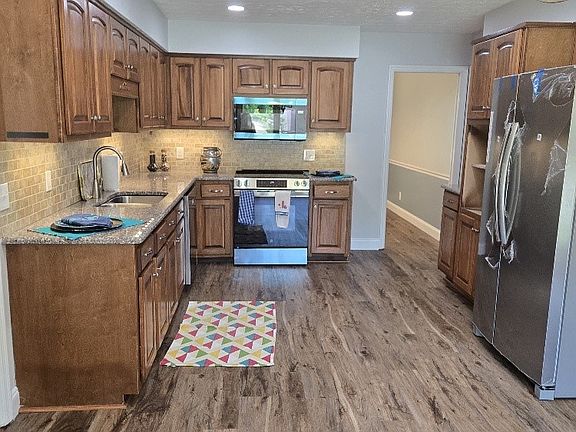 Welcome to this stunning 5-bedroom, 3-bath all-brick home that blends classic charm with modern updates, perfect for families or multi-generational living. Step inside to discover brand-new luxury vinyl plank flooring, fresh interior and exterior paint, and an inviting layout designed for comfort and functionality. The spacious family room features a cozy fireplace flanked by built-in shelves, creating the perfect gathering spot. Enjoy meals in the separate dining room or casual mornings in the bright breakfast area off the updated kitchen, which boasts granite countertops and brand-new stainless steel appliances. A unique highlight of this home is the private 5th bedroom located on the opposite side of the house with a full bath—ideal for guests, in-laws, or a home office. The separate laundry room includes built-in shelving and a brand-new utility sink for added convenience. Relax and entertain on the large screened-in porch overlooking your backyard oasis, complete with an inground pool and a utility shed for extra storage. The home also features a 2-car garage, a new roof, and two brand-new AC units for peace of mind and efficiency. Don't miss this move-in ready gem with space, style, and upgrades galore!