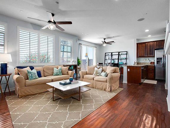 Located in the prestigious community of Mystic Point, this AMAZING VIEW home is a must see. Every room has a PANORAMIC VIEW toward Calavera Lake! Features include east facing, EXTREMELY PRIVATE and quiet backyard with low maintenance hardscape, stamped concrete, newer pet friendly turf, built-in island grill with stainless cabinetry, three bedrooms and three bathrooms, beautiful kitchen with granite counters and stainless steel appliances, engineered hardwood floors downstairs, comfortable living room with electric start gas log fireplace, spacious master bedroom with ensuite bath and walk in closet, air conditioning, plantation shutters, two single stall garages, extra hallway storage, and built in closet organizers. Close to community pool, spa, BBQ, and playground. Calavera Hills Community Park, Calavera Lake Preserve, and excellent schools are nearby.