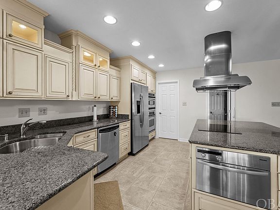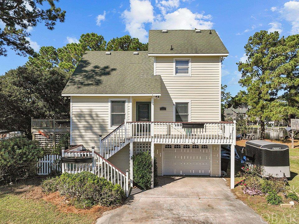 Canalfront home with a 10,000 lb boat lift and an ELEVATOR providing access to all 3 floors. Located in the desirable community of Kitty Hawk Landing with boat ramp and deeded beach access. The main floor features an open floor plan with high ceilings in the living room and sliding glass doors that open up to a large deck overlooking the canal. The remodeled (approximately 2006), eat-in kitchen has granite counters, walk-in pantry, a built-in Miele STEAMER and GE Profile stainless appliances including Advantium double ovens, flat top range, side by side refrigerator and dishwasher. The two secondary bedrooms are on this level as well. The top floor is a HUGE primary suite with bathroom, small balcony overlooking the canal and laundry plus attic access. On the ground level, pull into the garage with workshop area, bonus space with office area and additional bathroom (cold water).  Updates include interior paint 2023, exterior paint 2022, LVP flooring 2022, HVAC 2018, carpet in front bedrooms 2023. Most furniture can be available.