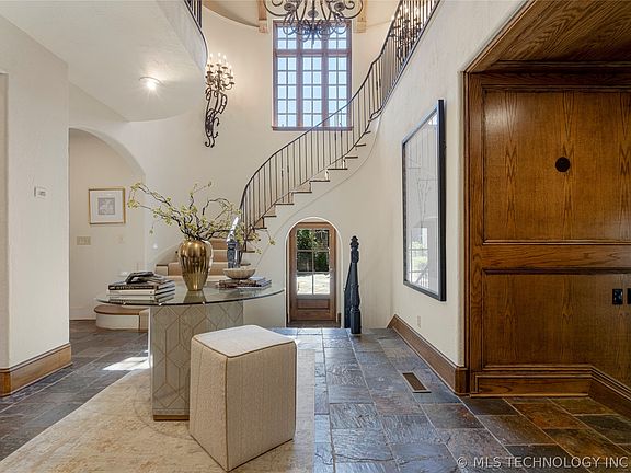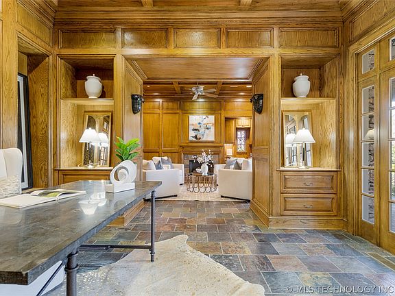 Nestled amidst lush surroundings, this magnificent home seamlessly blends the allure of an English Countryside Estate with all the modern amenities necessary for today's sophisticated lifestyle. The home has been meticulously designed/built by Mike Dankbar to offer historic character while embracing the conveniences and comforts of contemporary living. As the heart of the home the generous kitchen, completely and beautifully reimagined by the current owner, offers European design along with top-of-the-line appliances, custom cabinetry and honed quartzite counters making it ideal for culinary exploration and any gathering. Ample living spaces, adorned with intricate millwork, wood-beamed ceilings and cozy fireplaces, create an atmosphere of sophistication and warmth. From the cozy library to the comfortable living and generous dining rooms, each room tells a story of timeless elegance. Retreat to the private sanctuary of the owner’s suite, featuring pecky cypress ceiling, sitting area with fireplace, two private baths, two walk-in closets and custom built-ins. Upstairs you will find the additional bedrooms are generously sized and one can function as an upstairs master suite. Double custom, hand carved doors open to one of Tulsa’s most beautiful and authentic old Hollywood style theaters with all the amenities included. Across the hall, a full kitchen stands ready to prepare and serve guests with a full array of features. The upstairs also includes a second laundry as well as a Flex Space ideally configured to function as an Arcade, Guest Suite or Gym. The charm of the estate is not confined to the interior; the outdoor spaces are equally enchanting. Peaceful waterfall and expansive terraces, ideal for al fresco dining provide a serene escape. The Summer Kitchen provides indoor/outdoor living in all seasons with Twin Eagles gas grill, 2 gas burners, commercial vent hood, stone fireplace and wall of glass that opens to the courtyard. Roof is made of metal shingles.