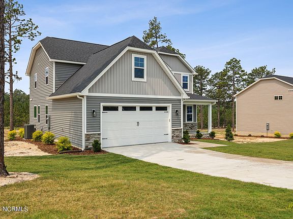 New construction in gated community Gretchen Pines! This home has 4 bedrooms, a bonus space and 3.5 baths. On the first floor you'll find open living spaces, lots of natural light and 9ft ceilings. Modern design and upgraded finishes here! The kitchen features energy star stainless steel appliances, shaker cabinets, soft close drawers, stainless steel farmhouse style sink, quartz countertops, modern tile backsplash and a walk-in pantry. The living room features a large ceiling fan and an electric fireplace. Beautiful and durable LVP throughout the downstairs. Recessed lighting through the home. Owner's suite with a large walk in closet is on the main level. The owners suite bath has a tub, walk in shower and double vanity. Upstairs you'll find 3 guest bedrooms with walk-in closets, a bonus room, 2 full bathrooms and the laundry room. Walk in storage space is off bonus room. The covered back porch is the perfect spot to relax at the end of the day. Over half acre lot! All cabinets are soft close. HIGH SPEED FIBER INTERNET is available in Gretchen Pines. Quick drive to Pinehurst, Southern Pines and Fort Bragg. Estimated to be complete end of June.