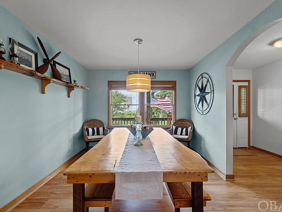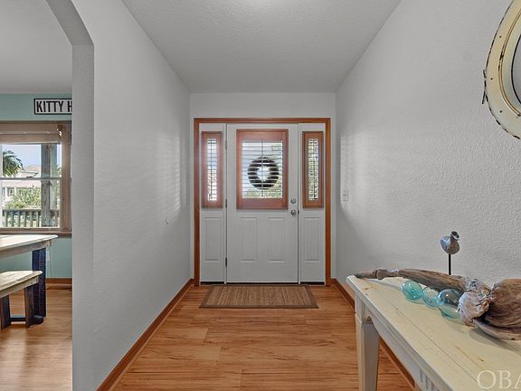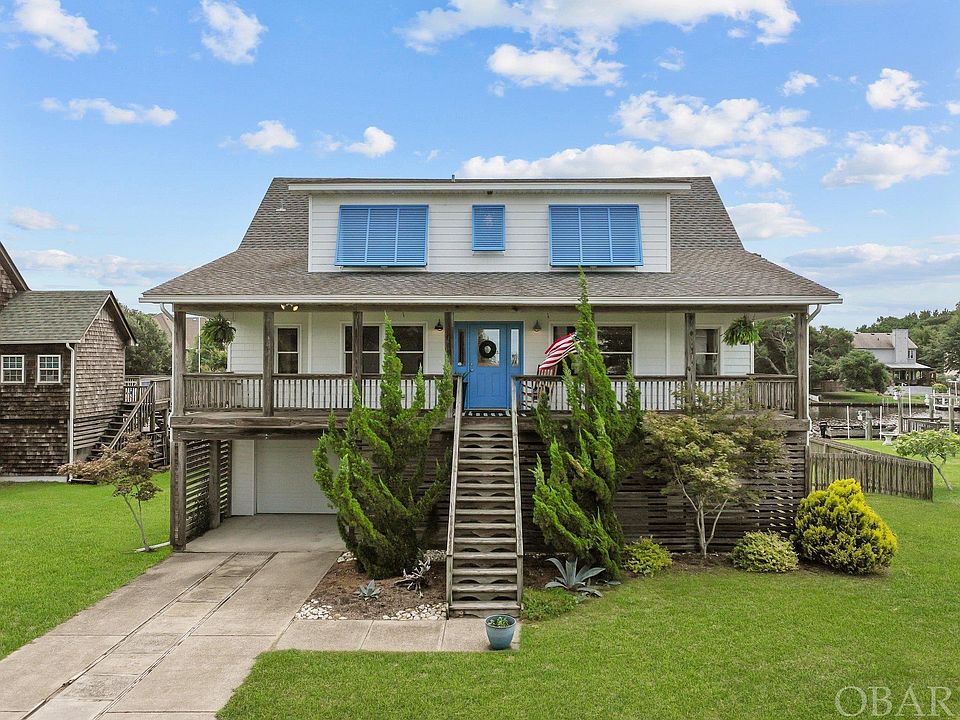 This well maintained 3 bedroom, 4+ bath home is located in the wonderful, waterfront community of Kitty Hawk Landing. This house will check all of the boxes with a well appointed kitchen, LVP floors and so much storage! The open floor plan with high ceilings and gas fireplace provide a welcome space for entertaining. All three bedrooms have enSuite bathrooms.  The primary bedroom and laundry room are located on the main level. Deep water canal with dock and boat lift provide easy access to the sound. The covered front porch provides some sound and sunset views. Enjoy the screened in porch and back deck which can be accessed from both the living area and primary bedroom. Follow the stairs down to the fenced in back yard and covered patio with outdoor shower. The ground level has a bonus space with bathroom and garage providing dry entry into the house. Don't forget the community boat ramp and deeded beach access!! It actually has 4 bedrooms but house only has parking for 3 bedrooms!