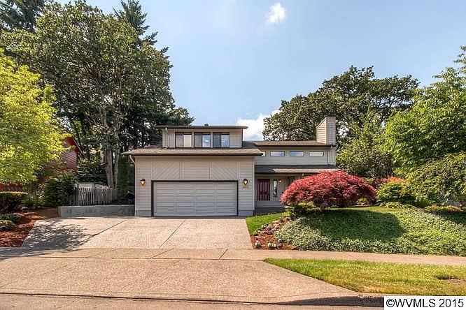 Stately Northwest contemporary in an excellent South Salem neighborhood off Pringle/Battlecreek. Dramatic architectural features, large laminated beams, and multiple floor levels. Light and spacious with three skylights and two solartubes, all replaced in 2004 with the new roof. A lot of windows, with views of Mt. Hood and city lights from the living room and family room. Tile entry, Berber carpet, recessed lighting, new slab granite counters in kitchen and master; lovely golden oak cabinetry and built-ins.