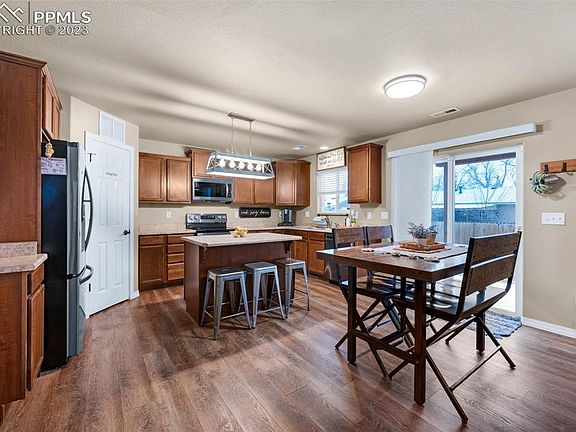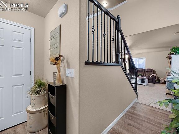 Opportunity Awaits! Immaculate 3 bedroom, 3 bathroom home is nestled in a quiet neighborhood, close to several schools, parks, a licensed day care, and Ft Carson. The main level has an open floor plan, beautiful hardwood/vinyl floors, and spacious remodeled kitchen with upgraded appliance and a center island, offering a warm welcome for family members and guests. The living room has a luxury ceiling fan, custom window blinds throughout the entire home. Recently painted exterior and several interior rooms, gives this relaxing home a recently built appearance. In the backyard you will enjoy the pergola covered cement patio, fenced in turf grass yard, sprinkler systems in the front and back yard, along with an irrigation drip for the front of the home. This 2-car garage is beautifully painted and insulated. Lots of walk-in closets throughout the home, along with a pantry in the kitchen. HOA fees, include trash removal for the year, snow removal, and assures for well maintained and clean neighborhood.