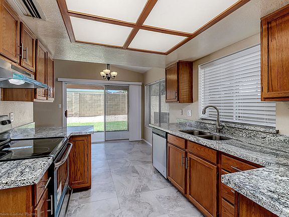 Newly REMODELED with GRANITE, SINKS, FAUCETS, 20'' TILE, all NEW STAINLESS APPLIANCES, NEW CEILING FANS, neutral paint. A quality built one-level INTEGRA-BLOCK home for energy efficiency. 4 carpeted bedrooms including a large vaulted master with walk in closet. Both full bathrooms have been updated with new sinks, granite, new faucets, & new matching tile. 2 large separate living spaces, 2 tone paint, finished covered patio, landscaped green grass yards, 2 car garage with soft water loop. Whole house replumbed 2015. New roof in 2011. Nice palmed lined neighborhood with very low HOA fees. Close to the new Six Flags water park and Paseo Park with soccer, baseball, & Pickleball, and shopping and movies at I 17 and Happy Valley! Property is totally move in ready and light , bright and clean!