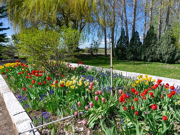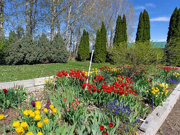 WONDERFUL ONE ACRE PROPERTY WITH SHOP AND RV HOOK-UPS! From the beautiful flower beds to the serene landscape, this home is a retreat! The spacious living room with its vaulted ceilings, bay window, and access to the back patio, flows directly into the kitchen and formal dining room creating the perfect space for entertaining. The kitchen boasts an island with seating for 4, abundant cabinet and prep space, pull out drawers, a walk-in pantry, and a desk area. The adjoining dining room has views of the yard and features custom built-ins! Allowing for separation and privacy, the master suite is on the north side of the home while the 2 additional bedrooms (both have large closets) are on the south side. The master bedroom suite features vaulted ceilings, wonderful natural light, sizable soaking tub, double sinks, separate shower and a huge walk-in closet. There is also a full bathroom, a storage closet and an oversized laundry room with folding table, deep sink and cabinet space. The outdoor enthusiast will enjoy the gorgeous raised flower beds, 14' x 55' covered patio, garden space, 24' x 40' shop with shelving, RV pad with full RV hook-ups, 2 storage sheds, 13 fruit trees, 5 water spigots and room for livestock. Property is easy to irrigate with 1 share of water rights!