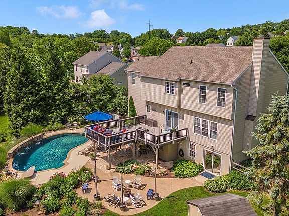 ****OPEN HOUSE HAS BEEN CANCELED****. Spend every day at your own private resort. This exceptionally well-cared for Sam Hill Estates home sits on a half-acre+ wooded-lot. Every inch of the property has been curated to inspire you to unwind and leave the day behind. Resort-inspired features include: a heated lagoon-style pool and waterfall, a stand-alone hot tub, and, gardens that have become the preferred stage of local songbirds. Take it all in while relaxing or entertaing on the ell-lit patio or the tiered deck. Inside, the Staycation continues on the first floor with a stone-hearth fireplace, an open floor plan with an eat-in kitchen, granite kitchen countertops, and, hardwood floors. Upstairs you will find a master suite with a generous walk-in closet, a luxury spa-bath that includes a double-sink vanity, separate shower and soaking tub. The lower level completes the vacation home feel with a custom bar, a second family room, full bath, game room with a pool table, and a walk out leading to the patio. The ROOF, HVAC, WATER HEATER, and CHIMNEY LINER were all replaced in 2020.