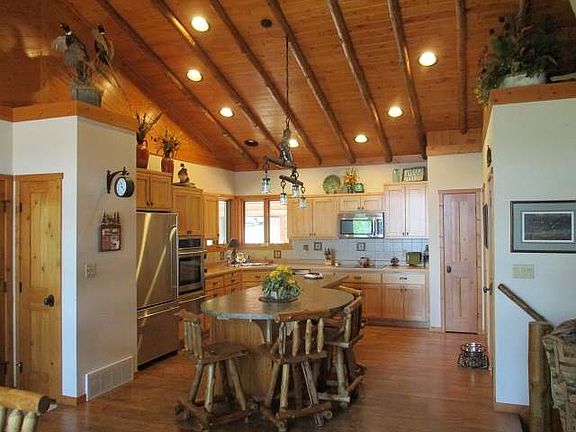 This Northwoods' custom home has been built with great attention to detail & is the perfect family retreat. This 3BR/2BA log sided year round home is situated on 100' of South facing, level sand frontage on the shores of Eagle Lake with access to the Eagle River/Three Lakes Chain of 28 Lakes. Some of the amenities include quality cabinetry, unique lighting fixtures, stainless steel appliances, wood floors, 2 free standing gas stoves and knotty pine & lodge pole cathedral ceilings. The main floor features an open concept Living/Dining/Kitchen area, Master BR, full bath & fantastic sunroom. The lakeside deck is just off the dining area & offers wonderful water views. The lower level is finished with 2BR's, a full bath, huge rec room, laundry area & a full walkout to the covered patio area. There is a fire pit for relaxing, a 2 car detached garage with a second floor bonus area and an extra outbuilding for additional storage. A Must see for the discerning buyer!