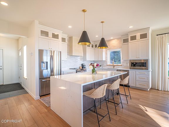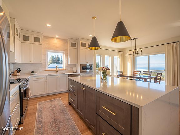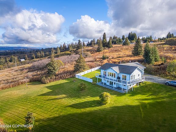 Perched on 5 private acres on top of Diamond Ridge, you will feel like you are living in the clouds in one of Homer's best view properties. Vast unobstructed views of volcanoes, Cook Inlet, the Alaska Range and world-class sunsets from almost every room.Recently fully remodeled, boasting a bright open living area and kitchen, large primary with ensuite with incredible views on the main floor.Downstairs features 3 additional bedrooms, large second living area (also with great views!), full bath and large laundry room. Additional features include: in floor radiant heat, attached garage, detached heated workshop, large yard bordered with an abundance of fireweed, additional fenced yard, and wind generator.