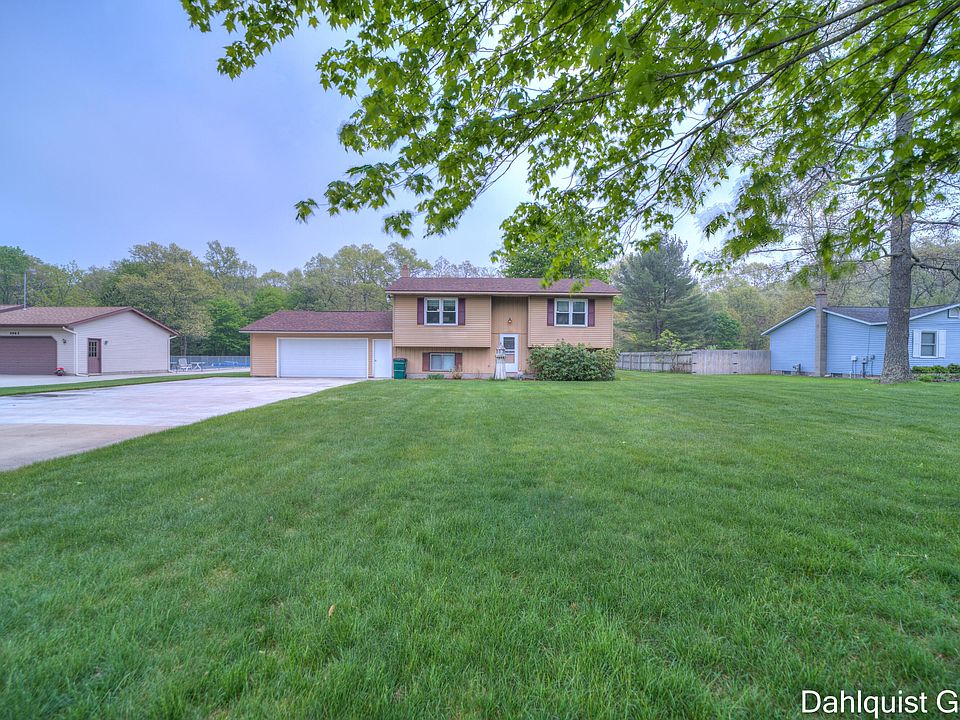 Set back off the road you will find this great bi-level home in Reeths-Puffer schools. This home features an updated kitchen with quartz countertops, subway tile and pantry. The dining area has a slider that leads out to the deck over looking the backyard and sunroom. The upper level also has a large bedroom and full bathroom. In the lower level you will find an additional bedroom, full bathroom, laundry area and a large family room with daylight windows. The two and half stall attached garage has plenty of space for your toys and has an additional garage door on the back for drive through access. In the back you'll find an automatic awning over the patio, oversized shed and garden area. Don't miss out on this home!