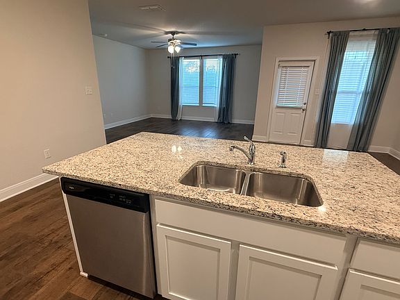 This open-concept home features tile flooring in main living areas, granite countertops, walk-in pantry, and spacious primary suite with walk-in closet, soaking tub, and separate shower.