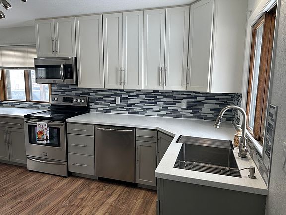 This fully updated ranch style home offers modern living at its finest!  The heart of the home boasts a fully updated kitchen featuring sleek stainless-steel appliances, gorgeous solid surface countertops and a stylish glass tile backsplash. A custom mudroom bench with hooks and shelving conveniently located inside the back door keeps things organized. The luxurious updates continue in the fully updated bathrooms, showcasing quartz countertops and ample linen closet space. On the main, you'll find three bedrooms, each with ceiling fans and light fixtures and custom shelving in the closets.  Recessed lighting throughout the home adds a touch of elegance. Downstairs you find a large bedroom with an egress window, additional family room and a full bathroom. This suite includes a fully functioning kitchen complete with an additional range, stove, and refrigerator.  Perfect for entertaining or as a mother-in-law suite. Outside, a covered back patio provides the ideal space for relaxation and entertaining in the fully fenced, private backyard. The property also includes an additional stall attached to the garage, plus a shed for extra storage. A covered barbecue area with electricity adds to the outdoor enjoyment. The detached oversized, 2 car heated garage has plenty of room for your vehicles plus a bonus workshop space w/ bench and shelving. The 83 Bypass is a minute away, offering fast and convenient access to the Mall, restaurants and Minot AFB.  Also, located within walking distance to the highly desired Bel Air Elementary school and a short drive to the New Minot North High School. This home truly has it all! Don't miss your chance to own this beautifully updated property. Schedule your showing today!