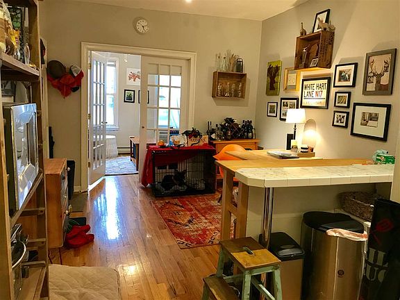 Adorable 2 bedroom 1 bath condo in the heart of downtown just minutes to path, shops and restaurants. An open concept kitchen and living area with hardwood throughout. 2 similar sized bedrooms situated on opposite ends of the unit are complete with ample closet space and tons of natural light. A huge private terrace, perfect for outdoor entertainment overlooks the newly renovated park on 1st street. Additional private storage room and shared washer and dryer complete the package!