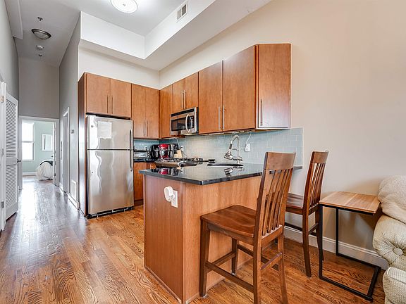 MODERN MEETS CLASSIC. Classic accents of a historic brownstone with a modern twist in upgrades are portrayed in this updated one bedroom suite. Adorned with a sophisticated style, this home satisfies everyday needs with: stainless steel appliances, black granite counters with breakfast bar and seating for two, large windows that allow natural sunlight to flood 658sqft of space, hardwood flooring throughout, spacious living room with an alcove perfect for an office space, high ceilings, central heating and cooling, in unit washer/dryer, spacious master bedroom with two closets and extra storage available in the basement. All this in a well maintained building close to public garages, parks, top rated restaurants and easy access to the PATH and Port Authority. Available Nov 1st.