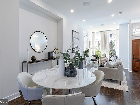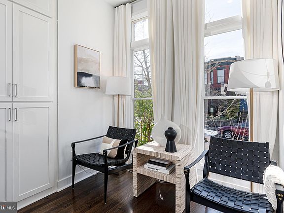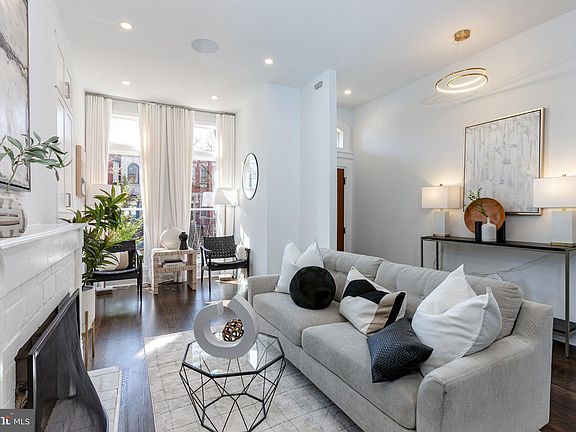 In the heart of historic Capitol Hill, this elegant 3-bed/2.5 bath fully renovated in 2020 row home seamlessly blends period charm with modern updates. The first floor features an open floor plan with chic, contemporary light fixtures, hardwood floors, and floor-to-ceiling windows that allow abundant afternoon light. Centered around a gas fireplace, the living room includes built-in speakers and cabinets for extra storage. The kitchen has timeless, Shaker cabinets, quartz countertops, Bosch stainless-steel appliances, and a breakfast bar. A powder room with gilded marble tilework is convenient for guests. The second level includes a primary bedroom with premium Shade Store window treatments, an inviting reading nook, and a modern ensuite bath. The second light-filled bedroom features an accent wall with gorgeous wallpaper and custom light fixtures. A bright third bedroom is perfect for an office or nursery. A sleek hall bathroom features custom design elements including glowing pendant lights, plus a laundry closet with a full-size washer/dryer completes the second floor. Entertain and relax under the vine-covered pergola with a glass of wine or invite friends and family for al fresco dining on the brick patio. The patio can also be converted to parking if desired. Nearby, you can stroll among the cherry blossoms in Stanton Park, shop or eat among the various vendors at Eastern Market, or dine at the many wonderful cafes and restaurants in the area. All amenities are at your doorstep including groceries at nearby Whole Foods. Impress out-of-town guests with guided tours of the Library of Congress, the Supreme Court, or the Capitol, all just down the street! This home and location are special in every way!