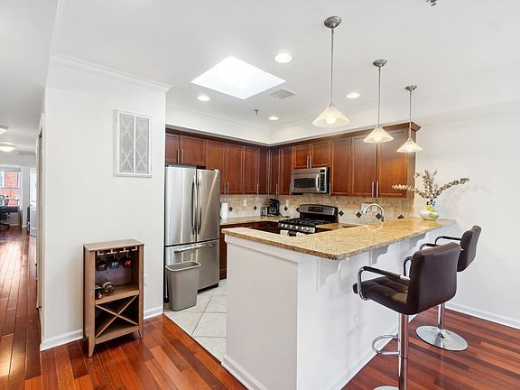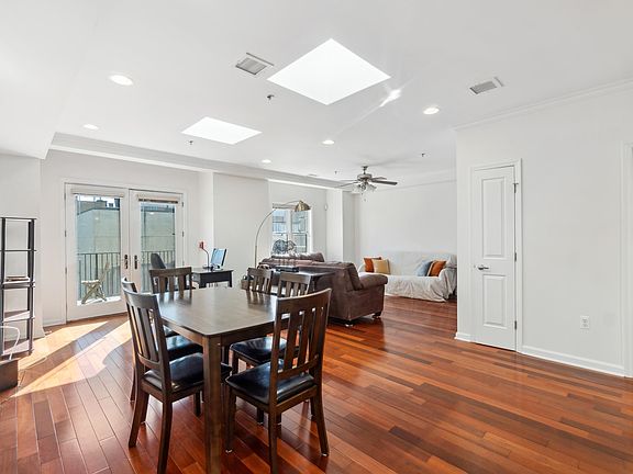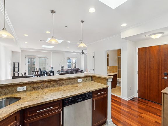 Welcome to this stunning 1,388 sq. ft. 2-bedroom, 2-bath penthouse apartment, offering modern comfort and luxury in every detail. Featuring a spacious, open-concept floor plan with beautiful hardwood floors throughout, this home is perfect for both relaxing and entertaining. The sleek kitchen is equipped with granite countertops, stainless steel appliances, a convenient breakfast bar, and plenty of cabinet space. Natural light pours in through skylights, enhancing the airy feel of the living space, complemented by recessed lighting and ceiling fans. The generously sized primary bedroom boasts an ensuite bathroom and ample closet space. The second bedroom is equally spacious. Additional conveniences include central HVAC, an in-unit washer and dryer, and abundant storage throughout. This penthouse is the perfect blend of luxury and functionality, providing everything you need for a stylish and comfortable urban living experience.