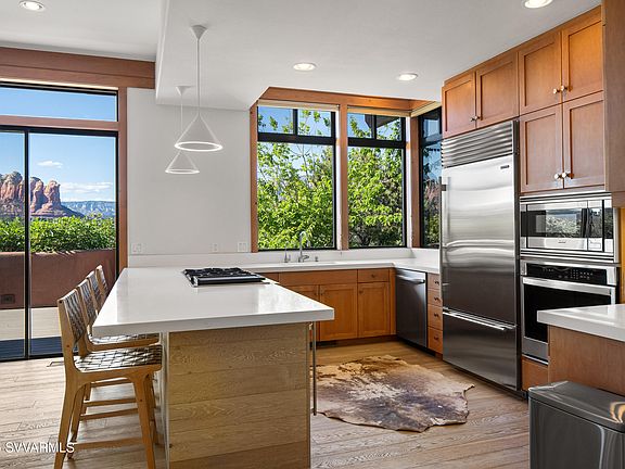 Beautifully remodeled 5BR; 4BA Sedona retreat, perched on a hilltop with awe-inspiring red rock views. Designed by award-winning architect, this home could be your next short-term rental powerhouse, offering impressive income potential. Features Include: Completely Remodeled Interior - New kitchen, bathrooms, flooring, and more. Flexible Layout: Main level features a spacious great room, modern kitchen, bar area, laundry, primary bedroom with en-suite bath, guest bedroom, and additional full bath. Lower Level: 3 bedrooms, a large family room perfect for entertaining, and easy access to the outdoors. Outdoor Upgrades: New hot tub, expansive decks, new landscaping, and a tranquil fish pond. Ideal for those seeking a luxury vacation rental in the heart of Sedona. Turn-Key & Furnished: $1.9M.