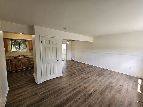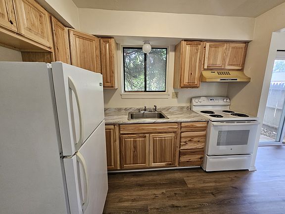 Two bedrooms, living/dining combo, kitchen, bath, basement, and patio. Tenant pays electric. Includes Stove, Refrigerator, and two a/c units.