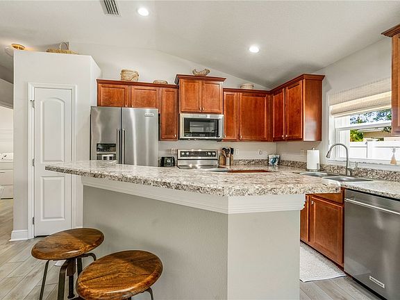 THIS HOME IS A SHOW STOPPER! Impeccably maintained, this home boasts updated features, including luxurious vinyl flooring, modern light fixtures, vaulted ceilings & freshly painted interior/exterior. The open concept kitchen is complete w/ SS appliances & ample storage. Step outside into the beautifully screened Florida room, overlooking the serene pond. The property is equipped w/ hurricane garage door and hurricane shutters for added security. Nestled within a highly sought-after gated community, residents will appreciate the low HOA fees, clubhouse, pool, & a kids playground.