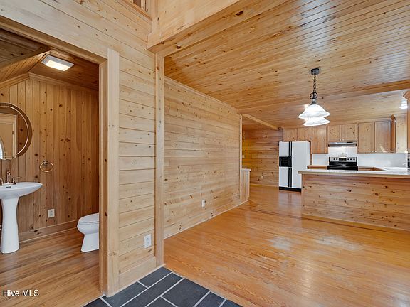 As you step inside, you'll be captivated by the rustic charm of cedar walls, floors, and ceilings, creating a warm and inviting ambiance throughout. The heart of the home is the living room, featuring vaulted ceilings and a striking stone fireplace, perfect for cozy evenings.