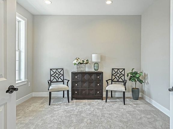 This charming 1-story home with welcoming front porch in the 55+ community of Home Towne Square includes 9' ceilings and a 2-car garage. Stylish vinyl plank flooring in the foyer extends to the living room and main living areas. The kitchen, featuring attractive cabinetry, quartz countertops with tile backsplash, and stainless steel appliances, opens to a sunny dining area with access to the backyard deck. The spacious living room boasts a cathedral ceiling and 2- story gas fireplace with a stone surround and box beam mantel. A carpeted flex space to the front of the home can be used as a home office. Tucked to the back of the home is a large owner's suite with expansive closet and a private bathroom with 5' shower and double bowl vanity. Questions? Please contact the community sales manager.