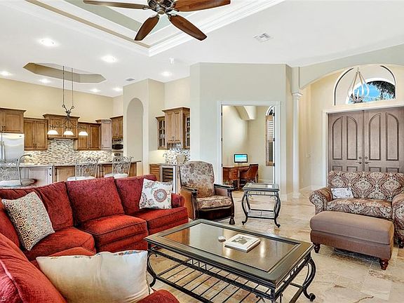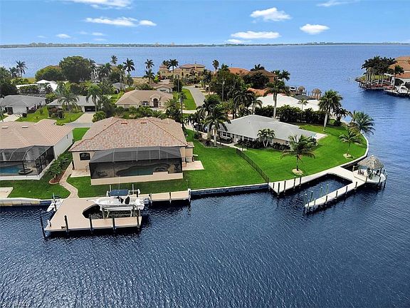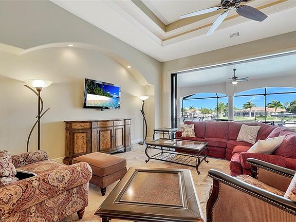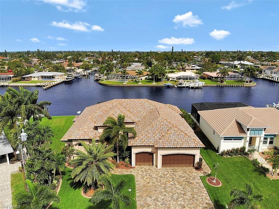 SECONDS FROM RIVER!! This Beautiful gulf access home with 3 bedrooms + den, 3 baths, pool home is just what you have been dreaming of. Loaded with upgrades from travertine tile throughout (including lanai), high end GE appliances, impact windows & doors, custom wood cabinets, granite counter tops throughout, 14' ceilings, Wet-bar with cabinets, wine storage & custom sink, 10' pocket sliders to the lanai, & more! Plenty of storage in this home The 3 car garage is lined with cabinets & the trusses above garage were engineered to carry heavier loads. A separate storage room on the side of home was built to match home for even more storage. Step out to the large lanai that is well equipped with a Florida Kitchen including grill, hood, 2 burner stove, refrigerator, storage & garbage. The New screen enclosure with no-seeum screening allows you to enjoy the heated saltwater pool & spa. Down by the water is a Custom built large dock with a 16,000 lb boat lift, water, fish-cleaning table, auxiliary 1,000 lb dinghy lift, 50 amp electric dock service, lighting, & room to park up to a 60-70' boat (6' draft). All this & a transferable home warranty. No expense was spared in this home.