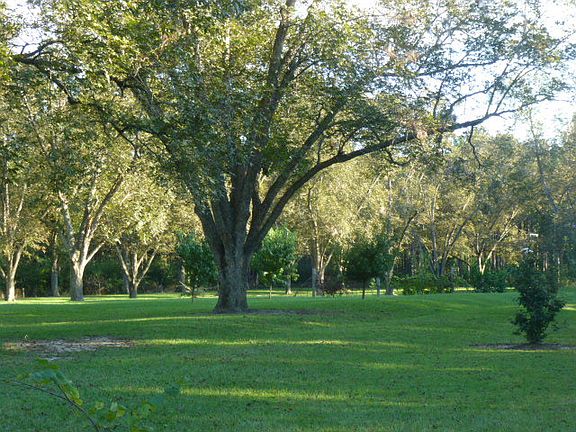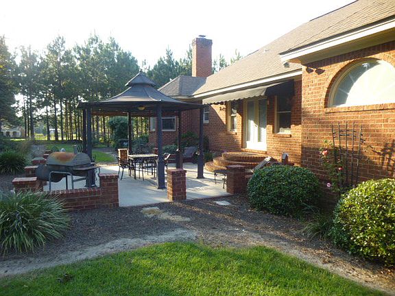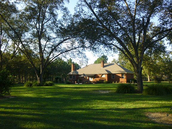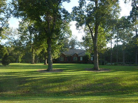 Brick home on almost 5 acres with 30 pecan trees. Lovely yard with many landscaped flower beds, back patio with pergola, storage building with front porch, grape vines and many beautiful trees. Interior is open and welcoming with wood floors, a fireplace in the den and one in the kitchen, large family room, formal dining room, beautiful kitchen with informal dining area and bar seating at the island, butler's pantry/wet bar with adjoining powder room, 2 guest bedrooms that share a hall bathroom, and a large master suite with luxury bathroom. There is a 2 car garage as well as a security system. Immaculate, updated and waiting for you!