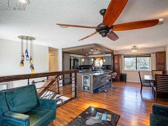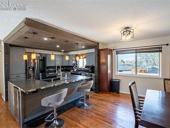 Gorgeous mountain views nestled in a quiet cul-de-sac, this spacious 5-bedroom, 3-bathroom home offers nearly 2,200 sq ft of living space on the largest lot in the neighborhood—over 14,500 sq ft/.33 acres. The main level features refinished hardwood floors and a bright, open layout, while the lower level boasts a cozy family room with a gas fireplace. The primary suite includes a walk-out deck right into the backyard. Entertain in style with a covered back patio, hangout shed with spa deck, and a built-in fire pit. The expansive backyard is fully fenced and ready for your personal touch. Additional highlights include a 1-car garage, poured concrete pad for RV parking or a future detached garage, and xeriscaping in the front yard. Walking distance to Widefield Community Park and close to major roadways. This home is an entertainer’s dream and a must-see!