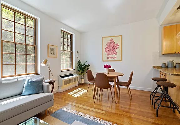 405 Dean Street #2A is a true gem of an apartment offering a flexible layout, beautiful southern light, extremely low monthlies and a tax abatement that extends another ten years! The apartment is one of eight units in this self managed and pet-friendly CONDO building located on a charming tree lined street in North Park Slope, close to transportation and shopping. As you enter through your private vestibule you are greeted by a roomy open kitchen with ample cabinet space, breakfast bar, and stainless steel appliances including a dishwasher. The kitchen overlooks the living area making it ideal for entertaining. The living space has beautiful built in shelving and offers a flexible layout with plenty of room for dining as well as a home office set up. Three large south facing windows offer treetop views and bring in a stream of light throughout the day. Down the hall lined with closets and a Miele washer/dryer set up, you will find a well-proportioned bedroom that can easily accommodate a king-sized bed and faces the gardens at the rear of the building. Central PTAC heating and cooling, lovely hardwood floors, a modern bathroom, and ample closet space round out the features of this highly desirable home. The location is ideal - situated just a block from Atlantic Terminal/Barclays Center where one can access nearly every subway line as well as the LIRR, and off 5th Avenue which is lined with fabulous restaurants and shopping. There is a community garden around the block and Prospect Park nearby as well.