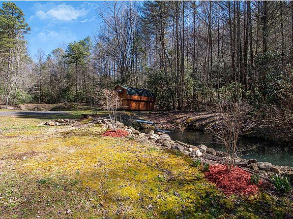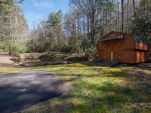 Beautiful cabin in the woods draws you in from the front gate. Sun dappled paved road through the trees, bordered by a small creek upon your entrance. Multiple ponds on your left as you arrive to the house with a storage building for your toys & fishing poles! Carport is enclosed on 3 sides and has beautiful poplar bark shingles. Cabin has a large master bedroom (on main level) with walk in closet & attached screened in porch. Second bedroom in loft for your guests. So many mountain finishes & details! Beautiful wood stove incased in rocks harvested from property. Roaring creek borders property with paths creating park like setting. Flat back yard perfect for a garden! Additional workshop with power to use for your projects! This mountain jewel is ready to be your new favorite place to be.