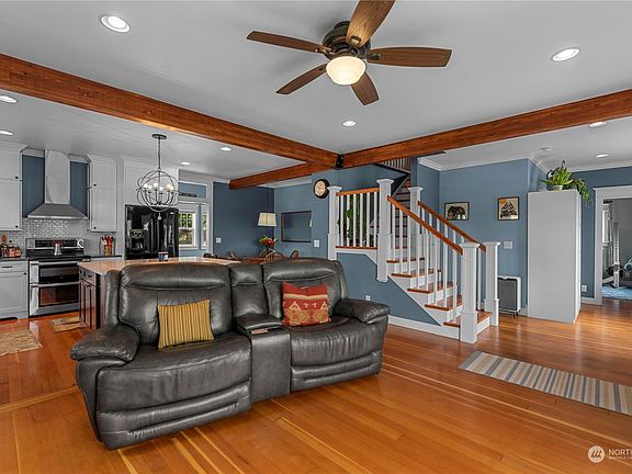 Exceptional, completely renovated home! Quality craftsmanship & bright detail in every room! The refinished fir flooring, wood beams, & open floor plan warm this home with historical charm. Enjoy baking cookies in this well-planned kitchen, oversized island with seating, cool quartz countertops, & excellent storage in Wellborn cabinets. Large sunny laundry room off kitchen with heated tile floor w/door out to large deck/yard & Extra Large 2 car insulated shop! Primary bedroom has deck too. Bathrooms are updated beautifully with subway tile surrounds, & heated tile floors to warm your feet. Many of the modern-craftsman light fixtures in the home have dimmers. Stately wood staircase leads to finished bedroom, open bonus room & ample storage.