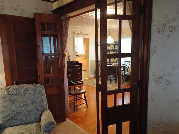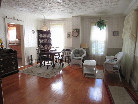 In the city limits of small town Harrisville,you will find the only yellow Victorian home on the block.The character that flows throughout the home is equally timeless. The hardwood floors that greet you as you walk in, with the added height of tin ceilings creates a wow welcoming. The hardwood floor does extend into the parlor area. The original stain glass in large picture window, etched glass in the entry door creates the character appeal like no other home. With the era of this Victorian home, there is presence of wallpaper throughout, as was a sign of richness in the day. The location is just a hop, skip and jump to the local shopping, and the harbor. Although in this era, garages were not the norm, there is room in the back yard, for additional outbuilding of your desire. There is one bedroom on the main floor with a bathroom, and three bedrooms on the second level with a bathroom. The full length large covered porch offers a complete wicker furniture set with swing. In fact most of the furnishings in the home will stay. Large deck in the back for grilling and entertainment.