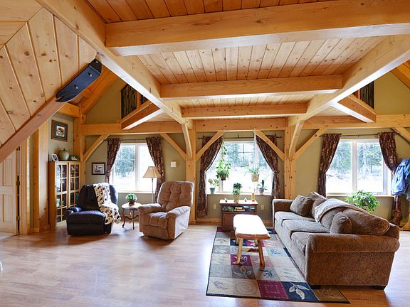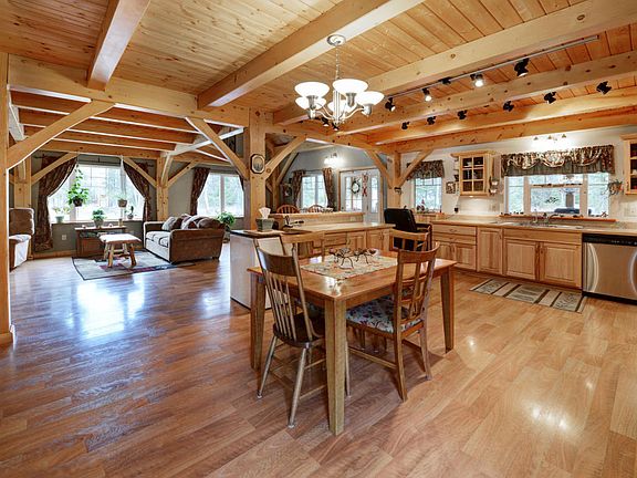 QUALITY TIMBERFRAME HOME in highly desired & paved neighborhood on Endicott. Hardy board siding,covered deck,circle driveway & lots of parking. Grand & open living design with cathedral T&G ceilings,big beams & custom metal artwork on stair railings. Master suite on main level has high vault,walk-in-closet,jetted tub & tile shower for 2.Stainless appliances & lg breakfast bar. FREE HOME WARRANTY!