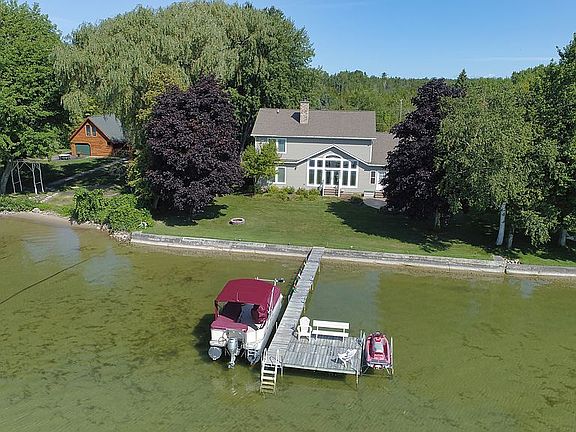 This immaculately kept 4 bedroom, 3 bathroom home provides the option for year-round use with 100' of frontage. Boasting 2800 sq ft. of the highest quality construction with an open concept floor plan, first floor master suite, vaulted ceilings, and fireplace will surely impress. The two-story wall of windows creates a panoramic view of this gorgeous lake. There is also additional storage with a building on the lot. This home is ideally located at the North End of the Lake, allowing you to take a short cruise for dinner at The Hack-Ma-Tack, or a leisurely trip up the Cheboygan River. This home is a unique find on Mullett Lake!