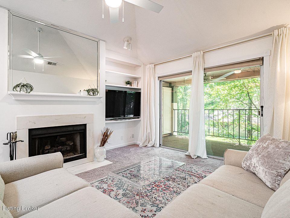 Enjoy easy living in this conveniently located, open-concept condo with 2 bedrooms, 2 full bathrooms, two balconies, in-unit laundry, over 1,100 finished SqFt. and a detached one car garage. The front door to the unit opens into the kitchen, which features a skylight above for natural light, breakfast bar peninsula with storage underneath, laminate countertops, white cabinetry, deep basin stainless steel sink, and white appliances including a GE refrigerator less than one year old. Along with ample countertop space and cabinet storage, there is also a pantry tucked away in the corner as well as a coat closet near the front door. The kitchen flows into the combined dining and living room with vaulted ceilings and another skylight and features a gas fireplace with marble surround flanked by built-in bookshelves. The sliding glass doors off the living area open onto a private balcony, allowing more daylight into the space and peaceful treetop views. The primary bedroom off the kitchen also has sliding glass doors onto a second private balcony. The en suite primary bathroom includes a single vanity with storage cabinet and granite countertop, a glassed door walk-in shower, and a huge walk-in closet with custom shelving. A hallway off the living room leads to the laundry room (washer/dryer to remain, Whirlpool dryer new in 2024) and the second full bathroom with ceramic tiled floor, single vanity with cabinet, drawers and granite countertop, a shower/tub insert and linen closet. At the end of the hallway is the second bedroom, which has two large closets and a wall-mounted drop-down desk. Newer lighting fixtures throughout along with ceiling fans in the bedrooms and living room! A bonus is the detached one car garage that is accessible from the parking lot, just around the sidewalk from the building entrance. The monthly HOA maintenance fee is $277 and includes trash, water, sewer, groundskeeping, exterior maintenance and master insurance. Other amenities include secured building access, plenty of surface parking, clubhouse, fitness room, outdoor pool, and beautiful grounds. If you are looking for a well-maintained, turn-key condo in a beautiful and serene setting with easy access to Shelbyville Rd and Hurstbourne Parkway, look no further than Forest Park!