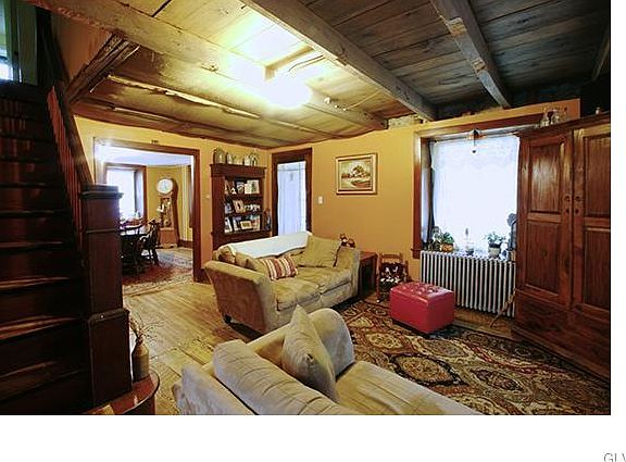 Sitting back off the road, this solid stone farmhouse is located on corner 3.36 acre lot. Large front porch to relax on and enjoy the outdoors. First floors consists of open beam living room. Kitchen has workable walk-in fireplace which appears to be from the original stone home dating back to the early 1800's. Kitchen also exits to porch. Three bedrooms. Walk-up attic for storage. Several outbuildings including summer kitchen, sheds, chicken coop and three car detached garage. Fruit trees on property.