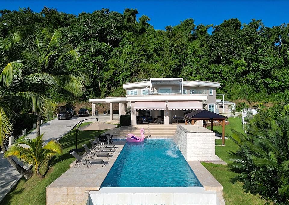 This impressive home, located in Carreras, Añasco, P.R., is a private estate offering 5 bedrooms, 4.5 bathrooms, and approximately 4,000 sq. ft. of construction on a 2,521 m² lot. It features 180-degree views of Puerto Rico’s West Coast and stunning sunsets through 20-foot ceilings and floor-to-ceiling windows. Designed for both relaxation and entertainment, the home includes an infinity pool with BBQ area, a detached studio with full bath, a custom basketball court, and a game room with pool table and PlayStation 5, comfortably accommodating up to 22 guests. Modern amenities such as a 50kW generator, 16k Outback solar system with 60 panels and net metering, storm-rated windows, gated entry with surveillance, two laundry areas, and a chef-ready kitchen with commercial appliances ensure convenience and peace of mind. Surrounded by lush landscaping with fruit trees including cacao, rambutan, parcha, and lemon, this property combines privacy and luxury just 20 minutes from the beaches of Rincón. CRIM: $2,729 annually