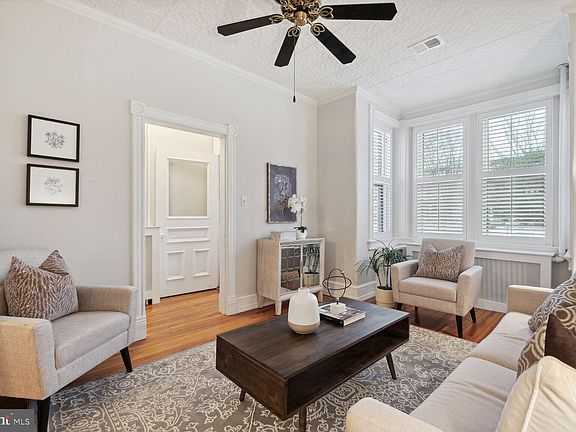 Renovated 3 bedroom/2.5 bath Victorian row house in Capitol Hill absolutely LOADED with character! Front entry has cute tiled vestibule with coat hanger hooks. Sunny living room has huge bay window with custom shutters for amazing natural light. Look up in the living and dining rooms to see the extra tall and BEAUTIFUL tin ceilings! Large dining room has space for expanded dining set. Recently gut-renovated kitchen (2019) has stainless steel appliances, gorgeous countertops, lots of cabinet storage, and separate water filter at sink. Powder room, hardwood floors throughout, crown moldings, and back door leading to large fenced-in back patio. BONUS: RARE finished cellar/basement perfect for storage, full size washer/dryer and utility room to maximize your living/closet space in the main house! Top floor features exposed brick in the hallway! The front, primary suite is amazing with large bay window, a wall of built-in closets, and newly-added primary bath! Large second bedroom, full hall bath, and LOVELY third bedroom with exposed brick walls! Amazing location, just 1.5 blocks to the Metro, grocery just step away, and close to neighborhood favorites The Pretzel Bakery, Trusty's and The Roost!