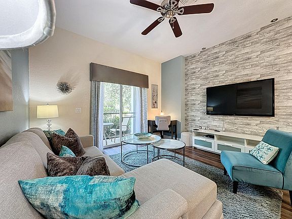 Feel at home in this ground floor remodeled three-bedroom condo at Bahama Bay Resort & Spa, perfect for family vacations or group getaways. This home features new furniture and a well-equipped kitchen with all major appliances, cookware, utensils, and glassware. Enjoy the spacious living and dining area and take in the scenery from a screened balcony with tables and chairs. An in-home laundry room is also included. The condo offers comfortable King-sized beds in the master bedroom, while both guest bedrooms feature two twin beds. The living area provides a relaxing atmosphere with a flat-screen TV for cable viewing and free Wi-Fi service. The master bedroom includes an en-suite bathroom and access to a second patio with table and chairs. The kitchen is fully equipped with a refrigerator, stove, oven, microwave, dishwasher, dishes, utensils, pantry items, coffee maker, toaster, and kettle. A utility room contains a washing machine and tumble dryer. Outdoor free parking is available, with motorcycles allowed but not on trailers. Boats, trailers of any kind, RVs, and jet skis are prohibited. Located at Bahama Bay Resort & Spa, guests can enjoy shared pools, hot tubs, a pool table, and beach volleyball. Situated on the shores of Old Lake Davenport, the resort offers a sand beach, wildlife viewing from the pier, and hammocks for relaxation. Conveniently located only 10 miles from Walt Disney World, with local dining and shopping options nearby. Disney Springs, Sea World, Universal Studios, and Legoland Florida are all within a short drive. No pets and no smoking are allowed at this vacation rental. Access is limited to the community pool only, with no access to the gym and other amenities on the resort.