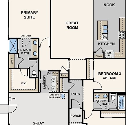 The Cobalt is a single-story plan offering 3 bedrooms and 2 bathrooms. The formal entry to the Cobalt provides an open view through the home to the great room. The open concept floor plan of the home maximizes furnishing options for the great room, kitchen, and nook area, providing the perfect area for entertaining and everyday life. The hallway near the entry offers a conveniently placed linen closet for additional storage and provides access to the laundry room and the Primary Suite, located in the back of the house. The Primary Suite bath features an oversized vanity and a compartmentalized lavatory for additional privacy. There's storage space to spare in the Primary Suite with a spacious walk-in wardrobe plus a separate linen closet. Two secondary bedrooms with a shared hall bath are located towards the front of the home.3 Bedrooms / 2 Baths / 2 Bay GarageOpt. 3-Bay GarageOpt. Covered PatioOpt. Den at Bedroom 3Opt. Tub at Primary Suite