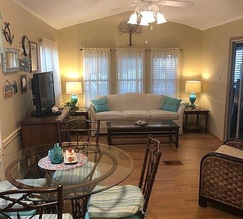Won't last long and ready to move into. This one bdrm, one bath park model comes completely furnished. Enclosed side porch. Covered front and back porches. Outbldg.8 x 19 with washer, dryer and utility sink. Has a three car parking slab. This must see property is in Spanish Cove-1 Bedroom/1 Bath home-All furnishings including a Queen sleeper sofa and a Twin sleeper chair and all furniture included in the price. Home is nicely renovated and very clean with an enclosed Bama Room of 160 sq ft with HV/AC vent. The Bama room is perfect for guests or a home office. This home is furnished with a lot of beach style. Owner has updated the plumbing which includes a new tankless water heater that runs with endless hot water. There is no history of Smoking or pets in the property. Enjoy the quiet private backyard with a privacy fence and a back covered patio and open deck area. The home's backyard conveniently backs up to the RV Club house. Property has a concrete driveway with space for 3 car parking. There is a shed on the property that has a washer and dryer. The home is set on a concrete pad with 4 point tie downs and a metal roof (important for insurance purposes). This is a gem in Spanish Cove where you can enjoy all the amenities of Spanish Cove...Pool, clubhouse, tennis courts, fishing pier with beach and 24 hour security. One time buy-in transfer fee of 600.00. Come see your new home. This must see property will go fast.