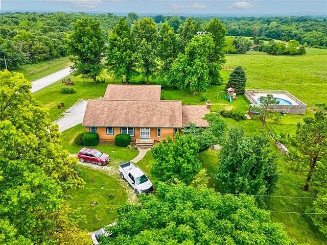 Spectacular views from this tranquil property located only 5 miles N of 50 Hwy! With 3 additional non-conforming bedrooms in the basement, there's room for everyone! HVAC is geothermal! Primary bedroom has a built-in cedar storage bench! Attic has easy access and lots of storage space. Storm shelter in the basement. Detached, insulated, 3-car garage is large enough for your RV and work area. Home & garage has steel siding. Three-stage Koi pond with large patio area. Above-ground pool with deck. Stocked pond. Many flowering and shade trees plus pears, blackberries and asparagus. Good wire fence for horses or cows. Square 10.83 acre tract, 1/4 mile off blacktop.