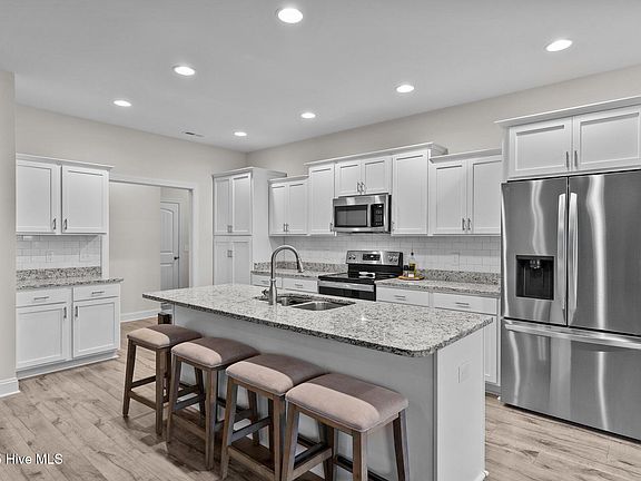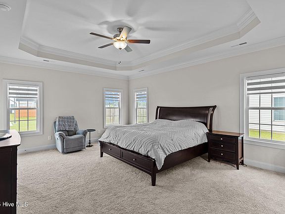 Built in 2022 and meticulously maintained, this like-new home sits on a spacious .42-acre corner lot in Rocky Point's Wylie Branch community. With 5 bedrooms, 4 full bathrooms, and 3,139 square feet of beautiful living space, this home provides room to live, work, and play-complete with a built-in basketball court. Inside, a wide foyer welcomes you into a bright, open layout featuring luxury vinyl plank flooring, crown molding, and a living room with a double tray ceiling and gas fireplace. The kitchen is a standout with granite counters, stainless steel appliances, a large island, a separate coffee bar, and a sunny breakfast nook that sets the stage for everything from weekday dinners to weekend brunches. Working from home? The formal office with French doors, wainscoting, and coffered ceiling makes it easy to focus. The first-floor primary suite includes private access to the back deck, a tray ceiling, and an expansive walk-in closet with natural light that conveniently connects to the spacious laundry room. The spa-like en suite bath features tile floors, dual vanities, a walk-in shower, and an oversized garden tub framed by marbled glass for privacy and light. A downstairs guest room and full bath offer flexible options, while two additional bedrooms on the other side of the home share a Jack-and-Jill bath. Upstairs, a spacious bonus room with en suite bath and oversized walk-in closet serves perfectly as a fifth bedroom, playroom, or media room. Zoned HVAC keeps every area comfortable. Outside, the large concrete patio is perfect for grilling and gathering, while the sodded backyard, raised garden bed, and basketball court provide plenty of room for fun. Additional highlights include beadboard interior doors, wide hallways, AT&T fiber-optic internet, ample storage throughout, and a 2-car garage. With a soon-to-be-built community pool just a short walk away, it's easy to picture life here-come check it out for yourself!