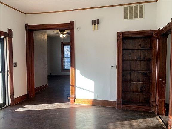 This adorable home has charming historic features that make it unique! The front porch is simply a Hallmark Movie spot, complete with a porch swing. The entire exterior and front door were just painted in the spring of 2023, the front door is such a fun color too! Come on inside & cozy up in a spacious living room that has a large built in book case for all of your books! The primary bedroom is located off of the living room with a large walk in closet & private bathroom. Check out the upstairs, recently painted and offers a 3rd bedroom, along with an office area. There is storage space in the attic too! Don't forget the back yard, there is a nice brick fire pit area, tall wooden privacy fence & even a tree house! This home is incredibly special and has a lot to offer!