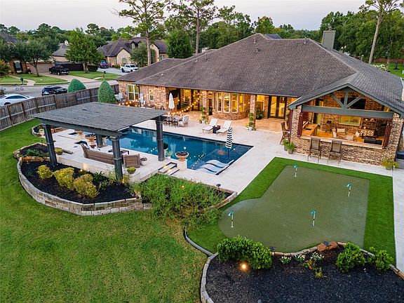 See Listing Video, Flyer & Pics*Custom-built Masterpiece Nestled within a Private Gated Community! Showcased in Coastal magazine in 2020, the home blends timeless architectural details with modern sophistication. Backyard oasis on half-acre corner lot—complete with Putting Green, Patio, Outdoor Kitchen (Smoker, Grill, Warming Drawer, Frig, Ice Maker, TV, etc), Pool with Chilling & Heater, 4 gas Caldrons, Spa, raised Pergola & Mosquito Mister. Upon entrance, you’ll be captivated by the extensive custom millwork—columns, doorframes, built-ins, wainscoting & coffered/tray ceilings—that evoke the grandeur of Galveston’s historic cathedrals. High ceilings, plantation shutters, travertine, wood floors & custom cabinetry with backlit glass shelving further elevate the interior. The chef’s kitchen impresses with 6-burner gas range, double ovens, warming drawer & more. Additional luxuries include whole-house Generator & 6+ car parking— a custom design that perfectly balances elegance & comfort.