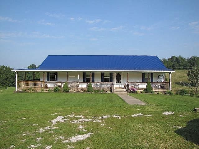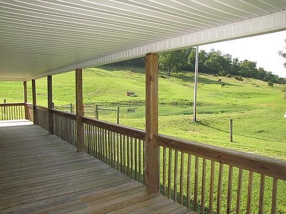 Nice 3br, 2bath home on 16 acres. Open floor plan with 3/4 wrap-around porch with offset deck in back. Large living room with vaulted ceiling, twin ceiling fans, and gas fireplace. Master bath has large jetted tub, separate shower, and his and hers walk-in closets. Open kitchen with rolling bar and lots of cabinet space and large swing-out pantry. Utility room has freezer space and utility sink. Barn has multiple horse stalls. 2 large loft areas, tack room for storage, and attached garage/workshop with concrete floor, full wiring, end and side garage doors and electric hoist on trolley rail. Land is fenced with high tensile wire. Large pond beside house is stocked with hybrid bluegill, bass, and large catfish. Second springfed pond in lower field for livestock water. Very peaceful country setting with great views all around.