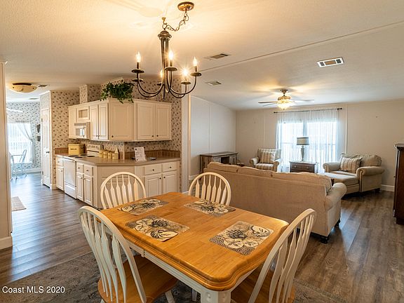 Beach Style, Updated and Water View! Check out the master bath cabinet with double sinks and solid surface counters, new flooring and an enclosed porch with vinyl windows to look out over the quiet pond out back. New roof and AC. You can even control the AC with your phone! This unit has everything you need to move in and enjoy this amazing 55+ community. You own the land in Lost Lakes. The HOA covers cable, internet, lawn maintenance, pool, security, workout room, pool tables, and fully functioning kitchen in the clubhouse. Play pickle ball or swim in the pool, hang out in the hot tub, there's so much to do. Want to watch a rocket launch? You can do that from your driveway. Want to head to the beach or Orlando airport? Both are only 30 minutes away. Professional pictures coming soon.