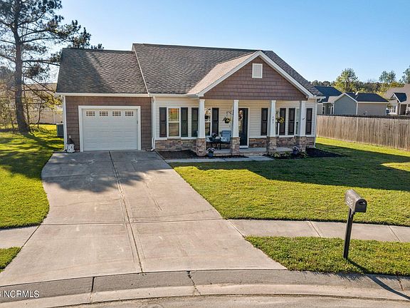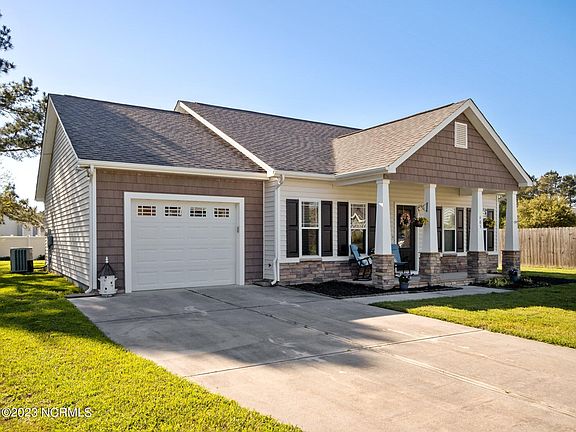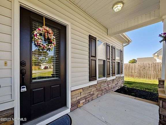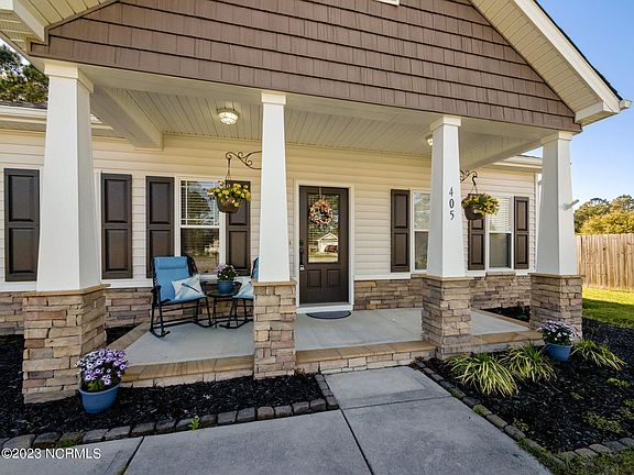 Welcome to 405 Patriots Point Lane in Swansboro's beautiful Charleston Park. This home is on a quiet cul-de-sac and features 3 bedrooms and 2 full bathrooms in a spacious 1,434 square feet. When you arrive, your eyes are drawn to the huge, covered porch with beautiful stonework and tapered columns. The curb appeal is completed with a large driveway leading to the garage and manicured grass in the front and backyard. As you enter the home, the large living room invites you in and provides a great space for entertainment. This home features a galley-style kitchen which boasts granite countertops, stainless steel appliances, and a proper pantry. The kitchen leads to a huge dining area that can fit a big family dining table. The large master bedroom features a walk-in closet and a master bathroom with a garden tub and shower. The opposite side of the home features 2 additional bedrooms, a full bathroom, and laundry room. This home is only one mile to Hammocks Beach State Park, six miles to Emerald Isle Beaches, half mile to Wal-Mart and local restaurants, and just fifteen minutes to Camp Lejeune. Schedule your showing today. Homes in this area do not last long!
