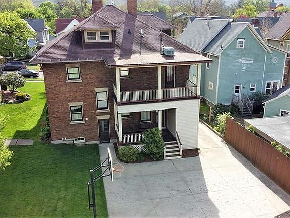 Move in condition brick home in the heart of the historic district. The 5-6 bedroom home has been meticulously maintained and updated through-out. The first thing you notice is the beautiful wrap-around porch that leads you into the foyer. The living room features an efficient gas fireplace and hardwood floors. The pocket doors lead you to the spacious dining room that flows into the updated eat in kitchen that has also been updated. The first floor also has a den, half bathroom with laundry hookups, and a large pantry. The second floor consists of five bedrooms including one with an on-suite full bathroom and laundry. There is also an additional full bathroom on the second floor. The third floor features the large master suite with attached full bathroom and walk in closet. Other features include newer electric, HVAC systems, and a two stall detached garage. Call today for a showing!